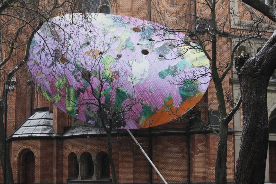 Katharina Grosse zeigt zum ersten Mal eines ihrer ellipsenförmigen Bildsysteme im Außenraum. Das 6 × 8 Meter große bemalte Objekt ist in einer Höhe von über fünf Metern so an die Fassade der Düsseldorfer Johanneskirche angebracht, dass es weit in den Raum hinein reicht. Die gesprayte Malerei weist über die Grenzen der gewölbten Oberfläche hinaus und wirkt, als würde hier nur ein Teil eines größeren Bildes sichtbar, welches sich in den Bildraum der Kirche hineinschiebt.
