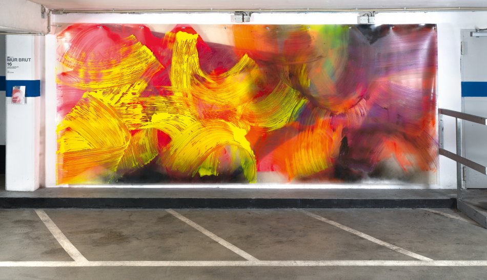In the work on view, the artist deconstructs her working method and translates the logic of her painting into an expanded concept of the work. Aberham distances herself from the canvas as a substrate and uses multiple sheets of transparent plastic, which she will install in front of the MUR-BRUT wall.
