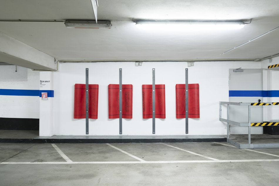 For the parking garage at the Kunsthalle Düsseldorf, Paulina Hoffmann has developed a group of sculptures that consists of four individual, unfolded lengths of synthetic fabric. These are each pressed against the wall by a flat steel element. This results in light structures whose physical and technical gestures develop a homogeneous rhythm through regular intervals.