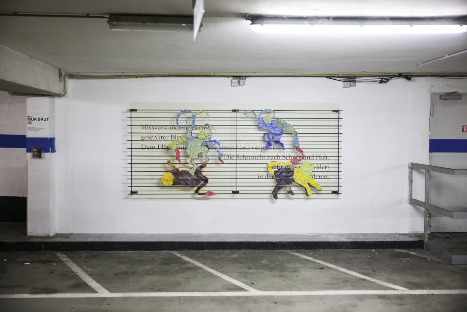 In collaboration with Jana Buch, Linhard explores the unusual union of guardian lions and cherubim as a love story. She highlights the technical and cultural amalgamation of different cultures, symbols, and materials and how these manifest in the context of craftsmanship and trade routes. The installation is augmented by Jana Buch with multiple layers of text on posters, flyers, and the wall itself.